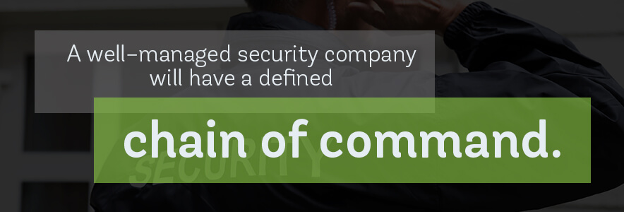 A well–managed security company will have a defined chain of command. This ensures that guards are properly supervised and that you know who to report to should problems arise with a particular guard.