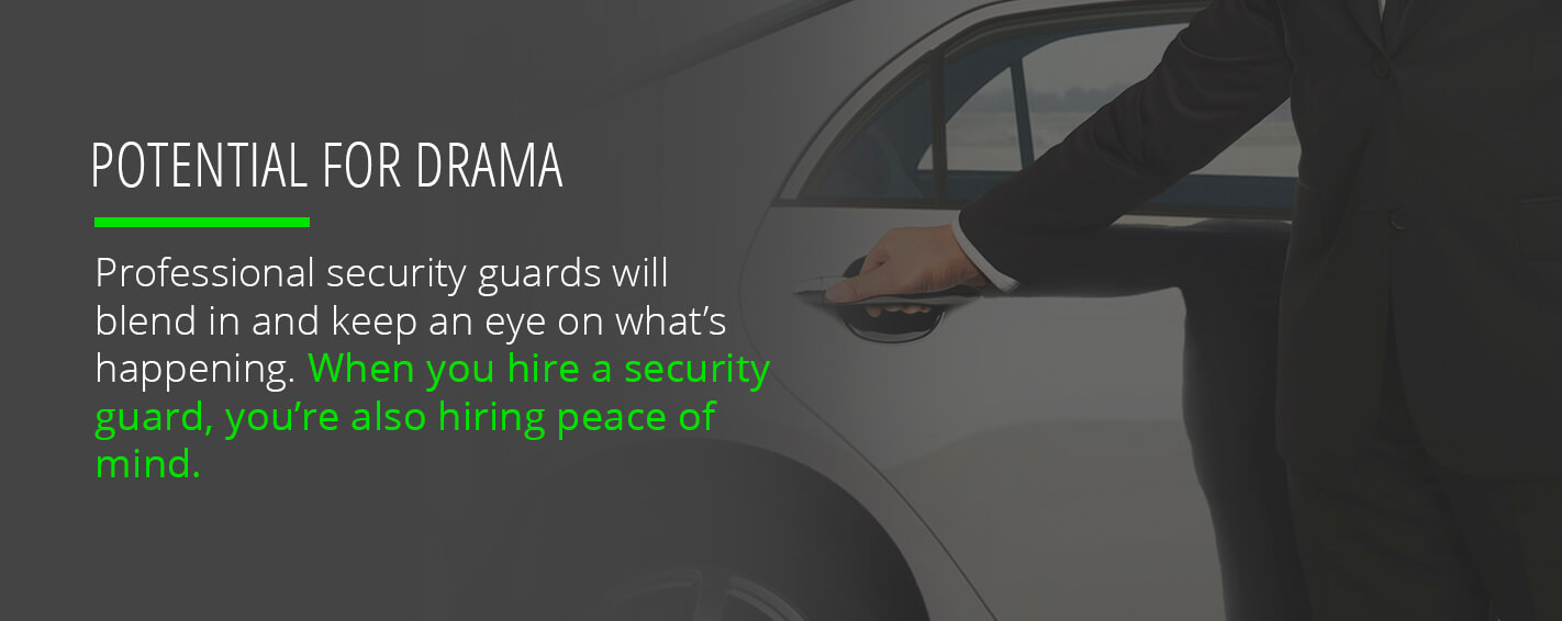 Sometimes when crowds can get rowdy, it’s good to know that your security team is ready to step in and calm things down at a moment’s notice. Often your security guards won’t have to do anything because the knowledge among your guests that you have security present will affect the way that people make personal choices for the rest of the event, and they’ll think twice about making trouble.