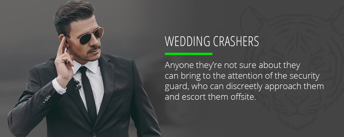 Security guards can work with you and your family in this case. You can ask both sets of parents to keep an eye on the guests. Anyone they’re not sure about they can bring to the attention of the security guard, who can discreetly approach them and escort them offsite. There is no need for your parents or another member of the wedding party to have to deal with what might be an unpleasant situation when you have a security guard who can handle it professionally and discreetly.